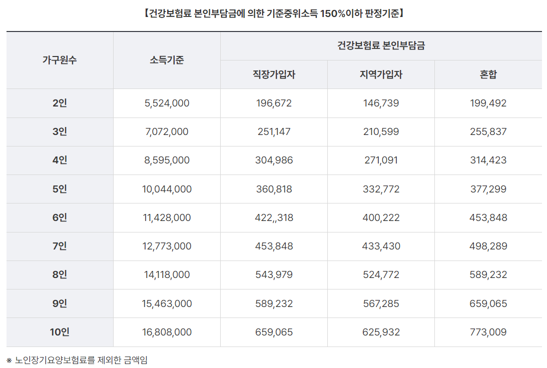 건강보험료 기준중위소득 150% 이하 판정기준